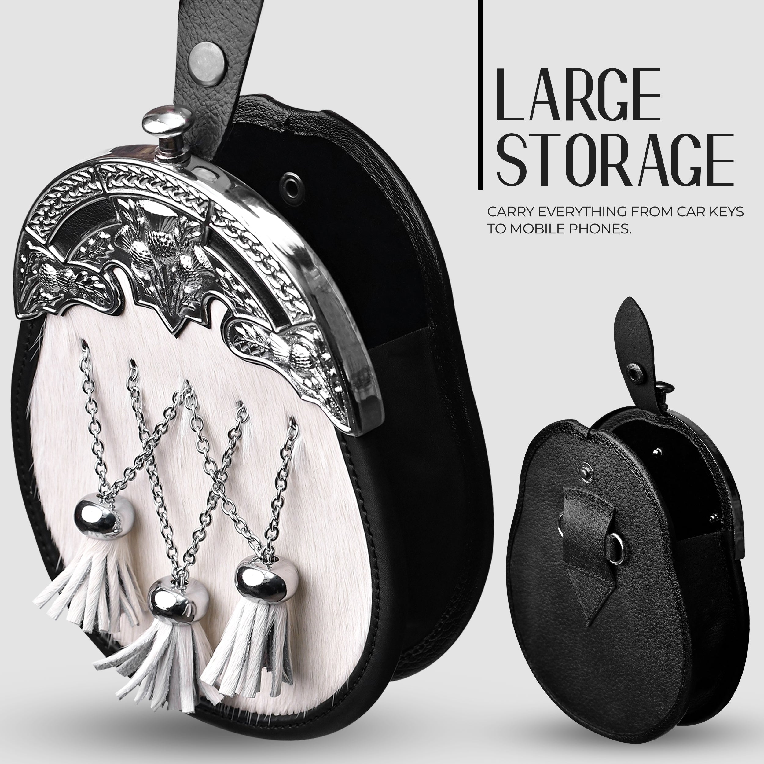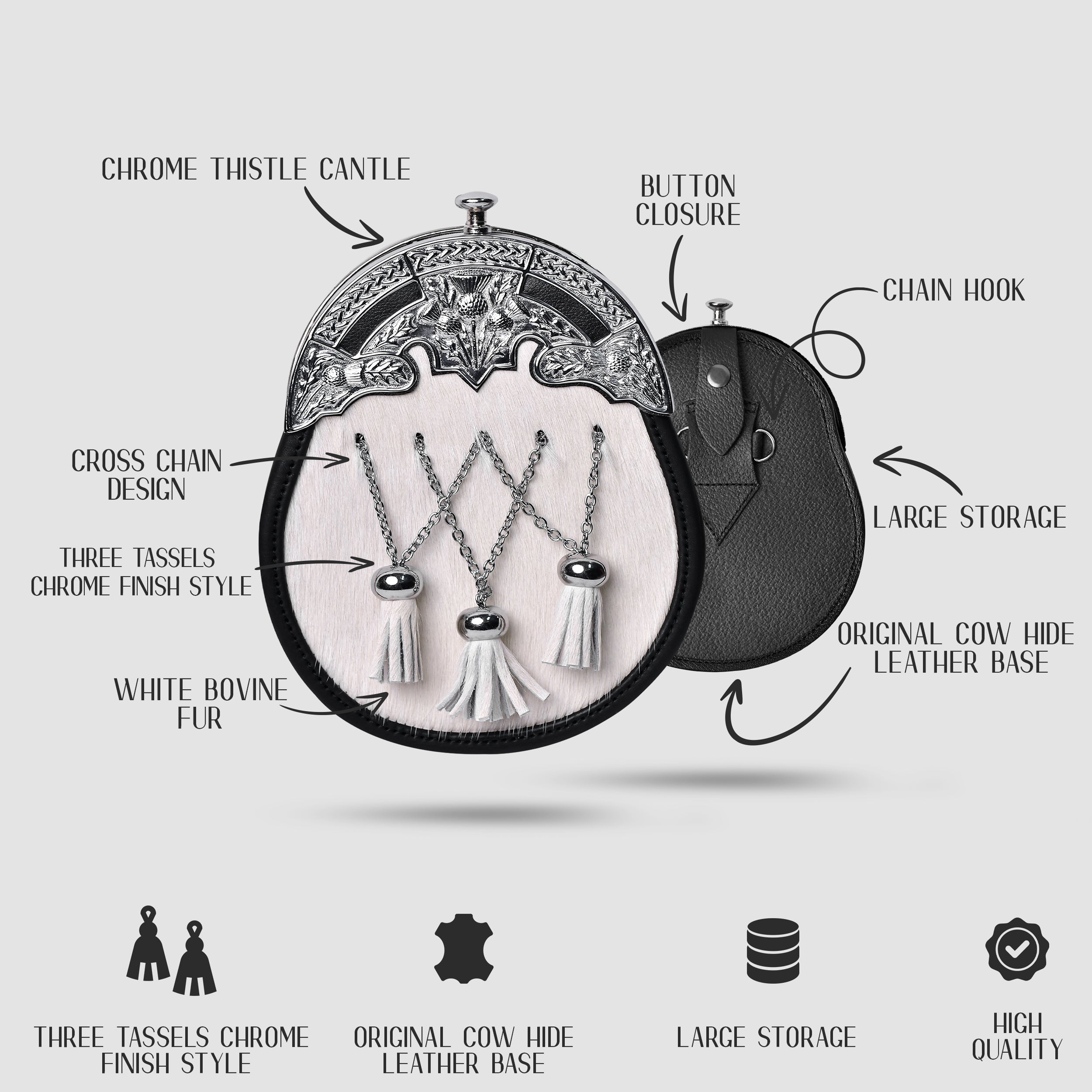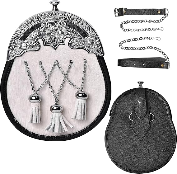 • Crafted from genuine black bovine fur with a chrome finished thistle cantle, adding a regal touch to your Highland attire.