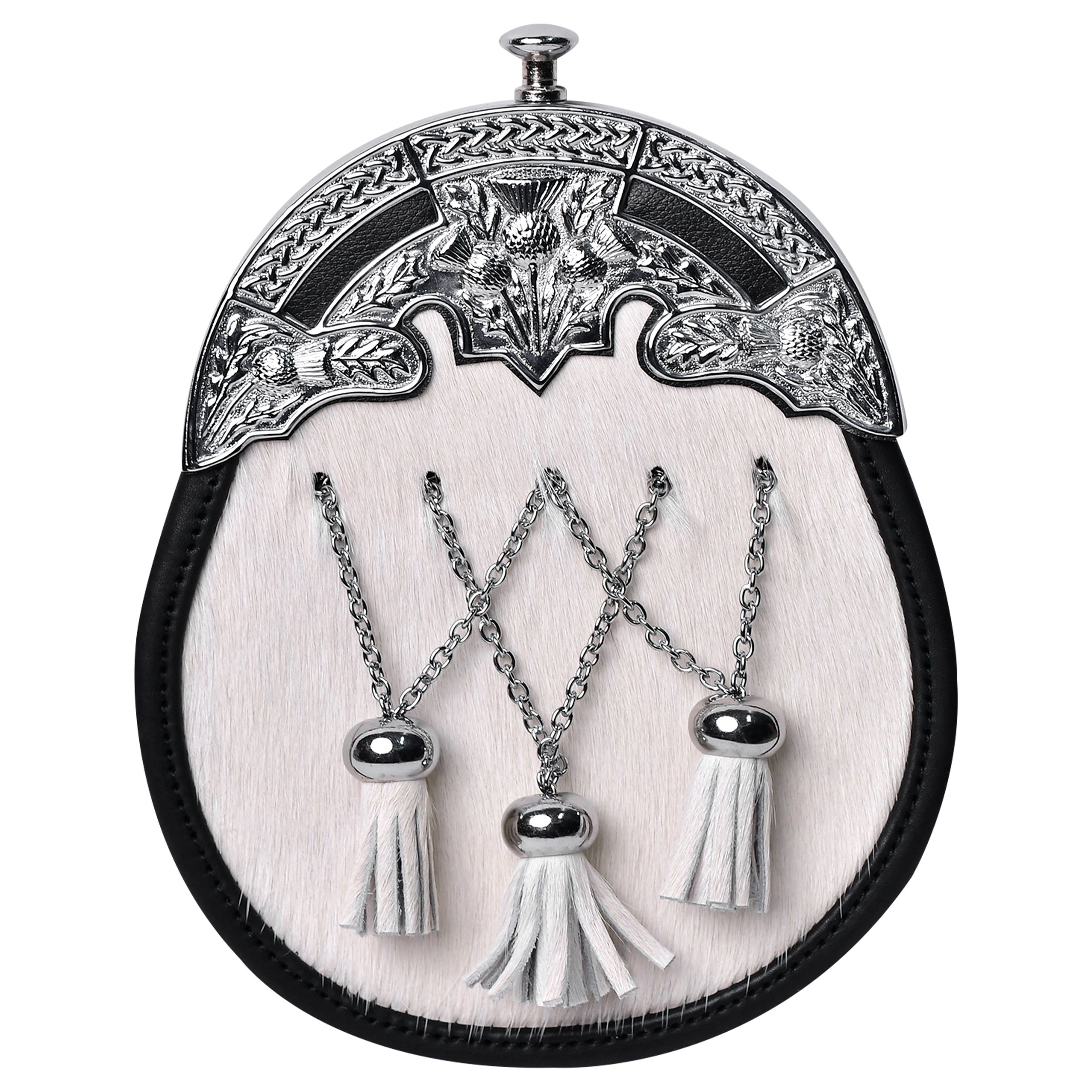 Formal White Bovine Cross Chain Sporran with Thistle Chrome Cantle